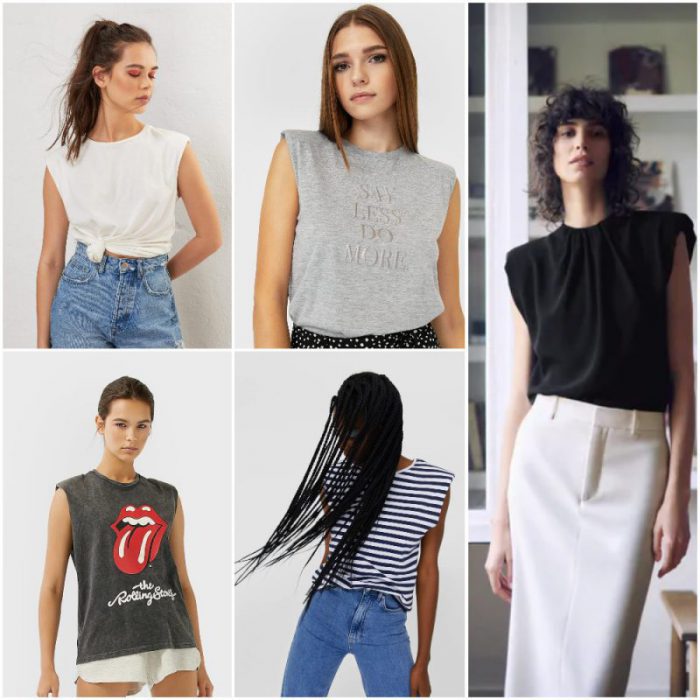- Camisetas con hombreras: Tienen aires ochenteros y este verano vuelven a ser la prenda más esperada.